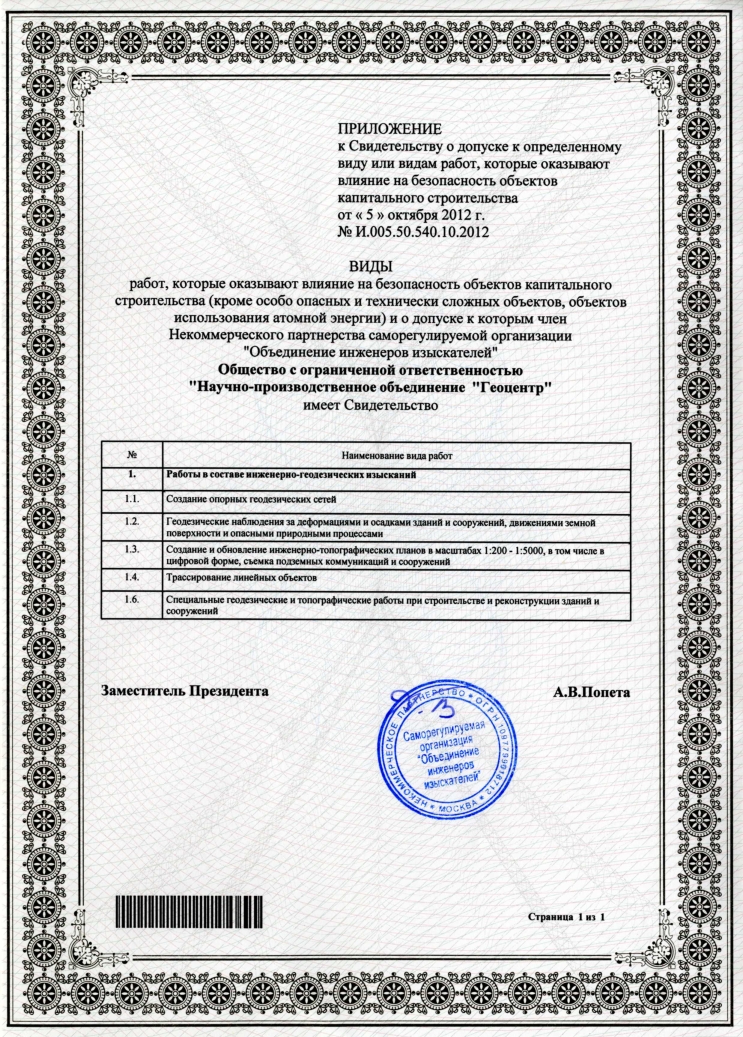 Свидетельство о том, что НПО «Геоцентр» является членом НП «Объединение инженеров изыскателей».
